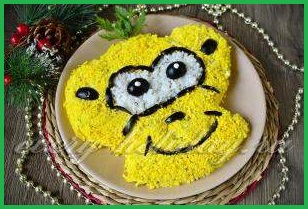 Блюдо может походить на оливье или селедку под шубой. Важно придать ему форму головы обезьяны. Для этого, сначала нарисуем озорное животное на листе бумаги, фото салатов обезьяна, также, можно найти в Интернете. Распечатываем изображение, затем по его подобию выкладываем рисунок из готовой смеси на большой плоской тарелке.